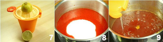 Geben Sie das gesiebte Fruchtfleisch wieder in den Topf und stellen Sie es zurück auf den Herd; in der Zwischenzeit pressen Sie eine Zitrone aus 7. Fügen Sie den Zucker zum Fruchtfleisch hinzu 8 und wenn die Mischung erneut zu kochen beginnt, geben Sie den Zitronensaft hinzu 9. Lassen Sie es weitere 40 Minuten kochen, dann, wenn die Mischung gut eingedickt ist, schalten Sie die Hitze aus und füllen Sie die heiße Kaktusfeigenmarmelade in die zuvor sterilisierten Gläser, wobei Sie 1 Zentimeter Abstand zum Rand lassen. Schrauben Sie die Deckel gut auf (aber nicht zu fest) und lassen Sie es abkühlen. Durch die Hitze der Marmelade entsteht ein Vakuum, das eine lange Aufbewahrung ermöglicht. Sobald die Gläser abgekühlt sind, überprüfen Sie, ob das Vakuum korrekt entstanden ist: Sie können in die Mitte des Deckels drücken und, wenn Sie das typische „Klick-Klack“ nicht hören, ist das Vakuum entstanden. Ihre Kaktusfeigenmarmelade ist bereit, genossen zu werden!
