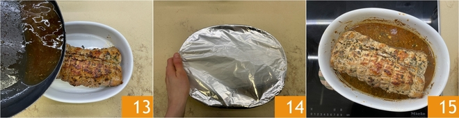 Gießen Sie den Bratensatz auf das Fleisch 13, decken Sie es mit Alufolie ab 14 und braten Sie es anderthalb Stunden im vorgeheizten statischen Ofen bei 180° C, oder bis das Fleisch im Kern eine Innentemperatur von 70°-75° C erreicht. Dann nehmen Sie den Braten aus dem Ofen 15.
