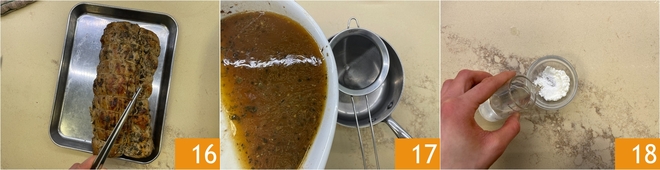 Übertragen Sie das Fleisch auf eine Platte 16 und lassen Sie es 5 Minuten ruhen, indem Sie es mit einem Stück Alufolie abdecken. Filtern Sie den Bratensatz direkt in einen kleinen Topf. In einer separaten kleinen Schüssel geben Sie die Maisstärke und das Wasser 18.