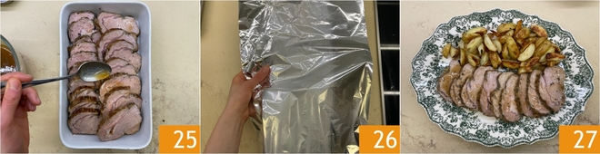 Wenn Sie ihn am nächsten Tag servieren möchten, legen Sie die Bratenscheiben wieder in die Form und gießen Sie die Soße darüber, die Sie erhitzt haben, um sie flüssig zu machen 25. Decken Sie es mit einem Stück Alufolie ab 26 und erhitzen Sie alles im vorgeheizten statischen Ofen bei 180° C für 15-20 Minuten. Nach dieser Zeit bleibt Ihnen nichts anderes übrig, als Ihren Kalbsbraten mit Marsala zu servieren, vielleicht zusammen mit Ofenkartoffeln 27!