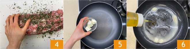 Um den Kalbsbraten mit Marsala zuzubereiten, schälen und hacken Sie zuerst den Knoblauch zusammen mit den Salbeiblättern und den Rosmarinnadeln 1. Nehmen Sie den bereits gebundenen Braten, salzen 2, pfeffern und bestreuen Sie ihn mit der Kräutermischung 3.