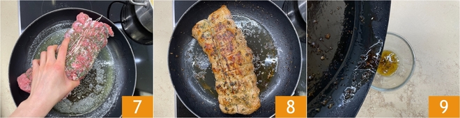 Wenn die Butter geschmolzen ist, legen Sie das Fleisch in den Topf 7 und braten es von allen Seiten gut an 8; dies dauert etwa 5-10 Minuten. Sobald das Fleisch gut angebraten ist, legen Sie es in eine Ofenform und sammeln den Bratensatz in einer Schüssel 9. Wenn Sie den Fettanteil entfernen, erhalten Sie eine leichtere Soße.
