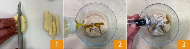 Um die Kalbsröllchen mit Speck zuzubereiten, schneiden Sie zuerst den Provola in Scheiben 1 und dann in Stückchen. Geben Sie das Paniermehl in eine Schüssel und würzen Sie es mit Öl 2, Salz und Pfeffer 3.