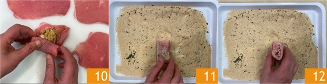 Schließen Sie zuerst die langen Seiten der Fleischscheibe und rollen Sie sie dann von der kurzen Seite her auf 10. Wälzen Sie die Röllchen im Paniermehl, um sicherzustellen, dass alle Seiten bedeckt sind 11 12.