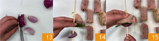 Schneiden Sie die Zwiebel in ziemlich dicke Scheiben 13. Bereiten Sie die Spieße vor, indem Sie in dieser Reihenfolge auf die Holzspieße stecken: Zwiebel, Lorbeer 14, Röllchen 15.