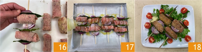 Fahren Sie fort mit weiterer Zwiebel, Lorbeer, Röllchen. Beenden Sie mit einem weiteren Lorbeerblatt und einer Zwiebelscheibe 16. Legen Sie die Spieße auf ein mit Backpapier ausgelegtes Blech und beträufeln Sie sie mit etwas Öl 17. Backen Sie sie bei 180°C für 25 Minuten. Erhöhen Sie dann die Temperatur auf 200°C und backen Sie für weitere 5 Minuten im Grillmodus. Nehmen Sie sie aus dem Ofen und lassen Sie sie leicht abkühlen: Ihre Kalbsröllchen mit Speck sind bereit zum Genießen. Servieren Sie sie mit einem frischen Salat aus Feldsalat und Kirschtomaten 18!