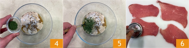 Fügen Sie auch die getrocknete Petersilie hinzu 4 und mischen Sie, um die Zutaten zu verbinden 5. Verteilen Sie das aromatisierte Paniermehl auf einem Tablett. Klopfen Sie nun die Kalbsfleischscheiben vorsichtig mit einem Fleischklopfer 6.