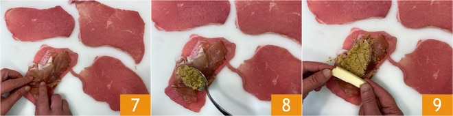 Legen Sie zwei Scheiben Speck auf jede Fleischscheibe 7, dann bedecken Sie sie mit dem Paniermehl 8 und fügen Sie ein Stück Provola hinzu 9.