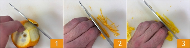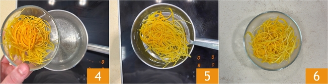Blanchieren Sie die Schalen für 2 Minuten in kochendem Wasser 4, dann gut abtropfen lassen 5 und in eine Schüssel geben 6. Pressen Sie alle Zitrusfrüchte aus und bewahren Sie den Saft auf.