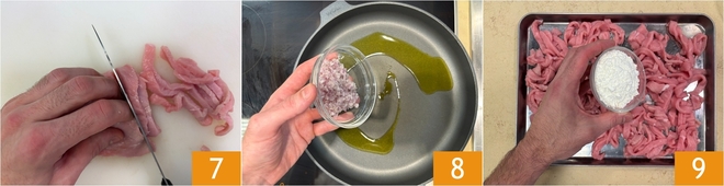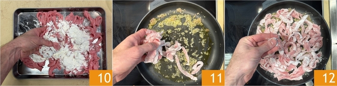 Mischen Sie, um die Kalbsstreifen gut zu bemehlen 10. Geben Sie sie in die Pfanne 11 und braten Sie sie noch ein paar Minuten an 12.