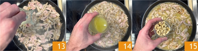 Salzen, pfeffern und mit dem Wein ablöschen 13. Wenn dieser eingedampft ist, fügen Sie den Zitrussaft 14 und die Cashewnüsse hinzu 15.