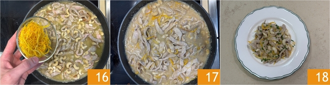 Fügen Sie auch die Hälfte der blanchierten Schalen hinzu 16 und mischen Sie gut 17. Lassen Sie die Sauce reduzieren und eindicken; die Streifen werden insgesamt etwa 15 Minuten kochen. Servieren Sie Ihre Kalbsstreifen mit Cashewnüssen garniert mit gehacktem Schnittlauch und Zitrusschalen nach Belieben 18!