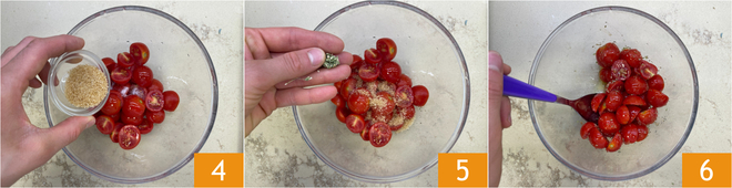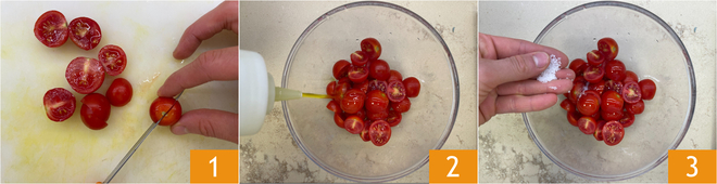 Um die kalte Pasta mit Rucola-Pesto und Kirschtomaten zuzubereiten, schneiden Sie zuerst die Kirschtomaten in zwei Hälften 1 und geben Sie sie in eine Schüssel. Würzen Sie mit Öl 2 und Salz 3.
