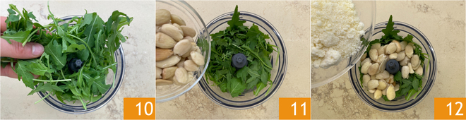 Während die Pasta kocht, können Sie sich dem Pesto widmen: Geben Sie in einen Mixer den Rucola 10, die Mandeln 11 und den Pecorino 12.