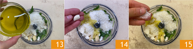 Fügen Sie auch das Öl 13, den Knoblauch 14 und das Salz 15 hinzu. Mixen Sie, bis eine homogene Mischung entsteht.