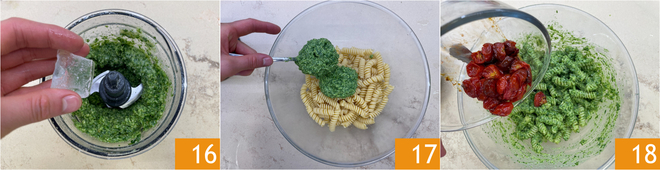 Wenn Sie möchten, können Sie einen Eiswürfel hinzufügen, um eine leuchtende Farbe zu erhalten 16. Lassen Sie die Pasta al dente abtropfen und würzen Sie sie mit dem Rucola-Pesto 17, dann fügen Sie die Kirschtomaten hinzu 18, wobei Sie darauf achten, einige für das Anrichten beiseite zu lassen. Gut mischen und anrichten.