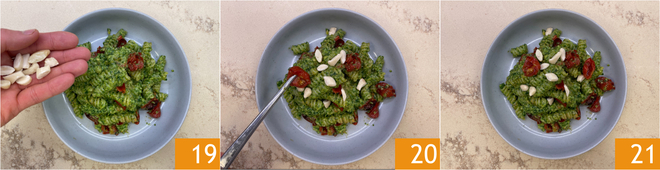 Vervollständigen Sie das Gericht mit grob gehackten gerösteten Mandeln 19 und den restlichen confierten Kirschtomaten 20. Ihre kalte Pasta mit Rucola-Pesto und Kirschtomaten ist bereit zum Genießen 21!