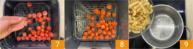 Legen Sie die Kirschtomaten mit der Schnittfläche nach oben in den Korb der Heißluftfritteuse, fügen Sie den restlichen Rohrzucker hinzu 7 und garen Sie sie bei 160°C für 10 Minuten, erhöhen Sie dann die Temperatur auf 180°C und garen Sie weiter für weitere 10 Minuten, oder bis sie trocken und karamellisiert sind 8. In der Zwischenzeit kochen Sie die Pasta in reichlich gesalzenem kochendem Wasser 9.