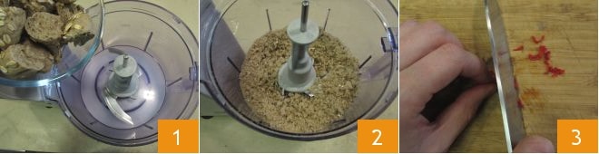 Um den kalten Nudelsalat mit Auberginen und Feta zuzubereiten, bringt ihr zunächst einen Topf mit Salzwasser zum Kochen, der euch später zum Kochen der Nudeln dient, dann nehmt ihr das altbackene Vollkornbrot, schneidet es in Scheiben, gebt es in einen Mixer mit Stahlklingen 1 und mixt es, bis ihr grobe Krümel erhaltet 2. Wascht die Chilischoten, entfernt die Samen und hackt sie fein 3.