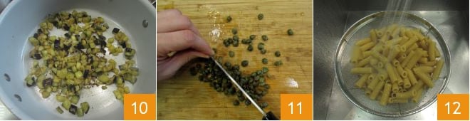 Bratet sie bei mittlerer bis hoher Hitze für 4-5 Minuten, bis sie gut goldbraun sind 10, dann entfernt den Knoblauch aus der Pfanne, salzt und pfeffert. In der Zwischenzeit spült die Kapern unter fließendem Wasser ab, um das Salz zu entfernen, und hackt sie mit einem Messer 11. Wenn die Nudeln al dente sind, gießt sie ab und spült sie schnell mit einem Wasserstrahl ab 12