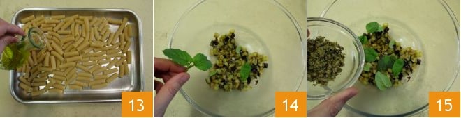 und lasst sie auf einem großen Blech abkühlen, nachdem ihr sie mit Öl gewürzt habt 13. Nehmt nun eine große Schüssel und vereint alle Zutaten: die goldbraunen Auberginenwürfel, die zuvor gewaschenen und getrockneten Minzblätter 14, die gehackten Kapern 15,