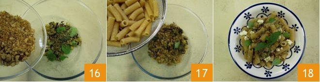 die gerösteten Brotkrümel 16, die Vollkorn-Tortiglioni 17 und schließlich den zerbröselten Feta 20. Gut mischen und die so zubereiteten Nudeln auf die Servierteller verteilen, zuletzt noch mit etwas Feta und Brotkrümeln garnieren 18: Euer kalter Nudelsalat mit Auberginen und Feta ist bereit zum Genießen!