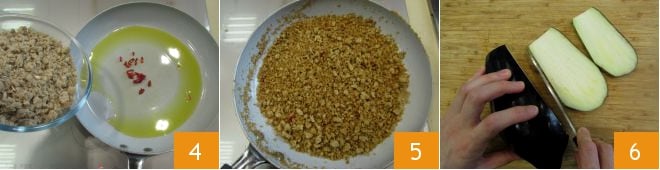 Gebt die Hälfte des Öls in eine Pfanne, fügt die gehackte Chilischote und die Brotkrümel hinzu 4 und lasst sie bei mittlerer bis hoher Hitze ein paar Minuten goldbraun werden, dabei darauf achten, dass sie nicht anbrennen 5. Wascht nun die Auberginen und entfernt die Enden; schneidet die Auberginen zuerst in Scheiben 6,