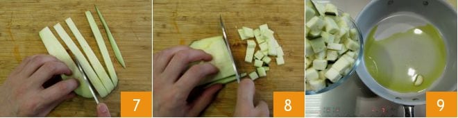 dann in etwa 1 cm breite Streifen 7 und schließlich in Würfel 8. Kocht die Nudeln in reichlich gesalzenem Wasser nach Belieben. Erhitzt in einer anderen Pfanne die andere Hälfte des Öls, fügt eine Knoblauchzehe und die Auberginenwürfel hinzu 9.