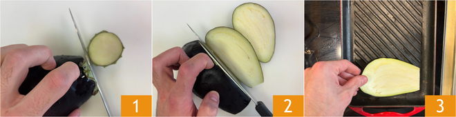 Um den kalten Nudelsalat mit Mozzarella und gegrillten Auberginen zuzubereiten, beginnen Sie mit den Auberginen: Entfernen Sie den Stiel 1 und schneiden Sie sie in etwa 3-4 mm dicke Scheiben 2. Legen Sie sie nach und nach auf einen gut vorgeheizten Grill 3.