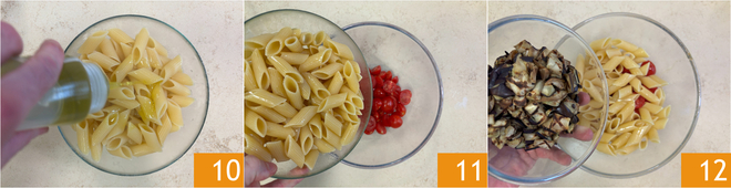 Gießen Sie die Pasta in eine Schüssel, geben Sie Öl hinzu 10 und lassen Sie sie abkühlen. Anschließend fügen Sie die Tomaten 11 und die gegrillten Auberginen 12 hinzu.