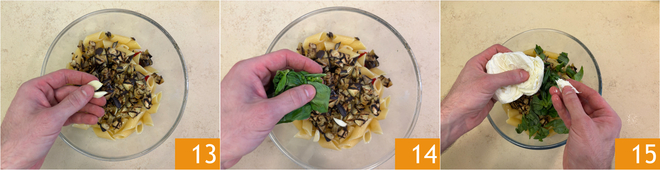 Fügen Sie auch den halbierten und vom inneren Teil befreiten Knoblauch 13, die Basilikumblätter 14 und die von Hand zerkleinerte Mozzarella hinzu 15.