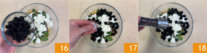 Vervollständigen Sie mit den Oliven 16, dann mit Salz 17 und Pfeffer 18 abschmecken,