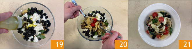 Würzen Sie nochmals mit einem Schuss Öl 19 und mischen Sie alles gut durch 20. Sie können Ihren kalten Nudelsalat mit Mozzarella und gegrillten Auberginen sofort genießen oder ihn mindestens eine halbe Stunde im Kühlschrank ziehen lassen 21!