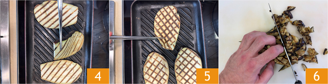 Wenn die ersten Grillstreifen sichtbar werden, drehen Sie sie um und lassen Sie sie weitergrillen 4; wenn Sie ein Schachbrettmuster wünschen, drehen Sie sie vor dem Umdrehen auf die gleiche Seite, aber in entgegengesetzter Richtung 5. Sobald sie fertig sind, schneiden Sie sie in etwa zwei Zentimeter große Stücke 6.