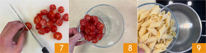 Nun halbieren Sie die Kirschtomaten 7 und geben Sie sie in eine Schüssel 8. In der Zwischenzeit bringen Sie einen Topf mit gesalzenem Wasser zum Kochen und kochen die Pasta bissfest 9.