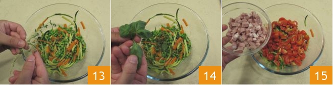 Wenn die Pasta abgekühlt ist, nehmen Sie das Gemüse aus dem Eiswasser und geben Sie es in eine andere Schüssel, um es mit den Thymianblättern 13, den Basilikumblättern 14, den Kirschtomaten und den Mortadella-Würfeln 15