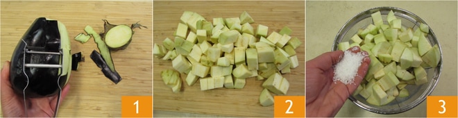 Um die kalte Pasta alla Norma zuzubereiten, nehmt die Auberginen, entfernt die Schale mit einem Sparschäler 1 (werft sie nicht weg, ihr könnt sie in Julienne schneiden und frittieren und zur Dekoration des Gerichts verwenden, wenn ihr möchtet), und schneidet sie dann in kleine Würfel 2. Salzt sie und lasst sie in einem Sieb abtropfen, damit sie das Pflanzenwasser und den bitteren Geschmack verlieren 3.