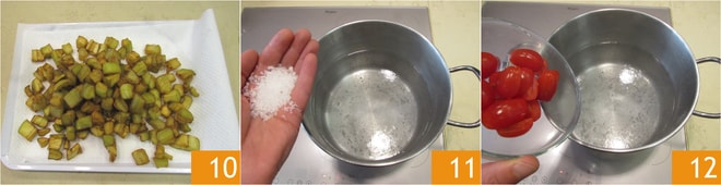 Legt sie auf ein Tablett, das mit saugfähigem Papier ausgelegt ist, um das überschüssige Öl zu entfernen 10. Bringt in einem Topf Wasser zum Kochen, salzt nach Belieben 11 und gebt 4 Kirschtomaten hinzu 12.