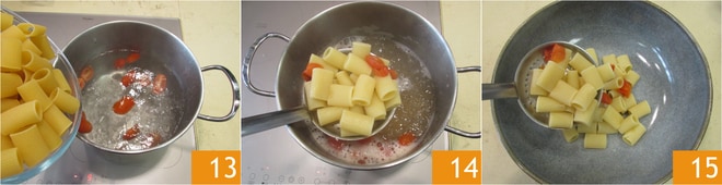 Zusammen mit den Kirschtomaten kocht die Pasta al dente 13 und gießt dann alles ab 14 auf die Servierplatte.