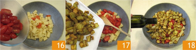 Fügt die Kirschtomaten hinzu, die ihr im Kühlschrank aufbewahrt hattet 16, sowie die zuvor frittierten Auberginen 17. Gut mischen und noch einmal mit einem Schuss Öl roh würzen 18.