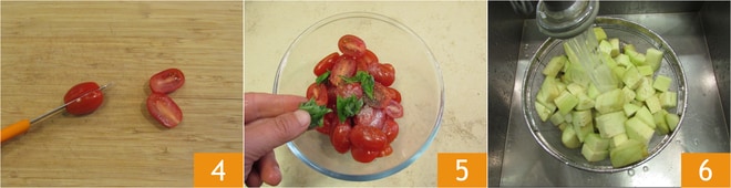 In der Zwischenzeit wascht die Kirschtomaten und schneidet sie in Hälften 4. Nehmt 4-5 zur Seite, während ihr die anderen in eine Schüssel geben und mit Öl, einer Prise Salz, Pfeffer und viel frischem Basilikum würzen könnt 5. Alles mischen und im Kühlschrank aufbewahren, damit sich die Aromen verbinden. Die Auberginen unter fließendem Wasser abspülen 6.