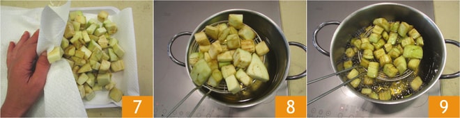 Trocknet sie gut auf einem saugfähigen Küchentuch ab 7. In bereits heißem Öl, bei etwa 170-180°C, bratet die Auberginen für ein paar Minuten 8. Wenn sie goldbraun sind, könnt ihr sie abtropfen lassen 9.