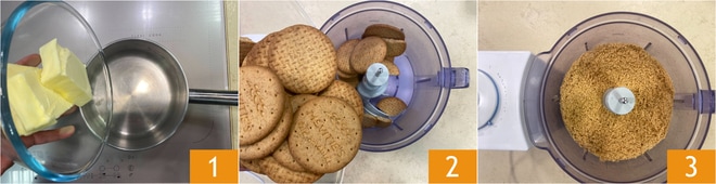 Um die kalte Sahnetorte zuzubereiten, beginnen Sie mit dem Boden: Schmelzen Sie in einem kleinen Topf die Butter bei schwacher Hitze 1 und lassen Sie sie gut abkühlen. Geben Sie die Kekse in einen Mixer 2 und zerkleinern Sie sie fein 3.