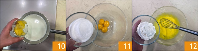 Erwärmen Sie in einem kleinen Topf die Milch mit der Zitronenschale 10, sie sollte nur kurz vor dem Kochen sein. In einer anderen Schüssel geben Sie Eigelb und Zucker 11, mischen Sie es mit dem Schneebesen und fügen Sie dann das Mehl hinzu 12.
