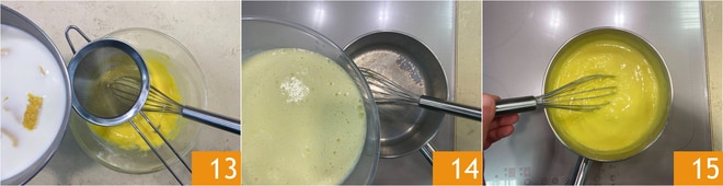 Gießen Sie die heiße Milch durch ein Sieb, um die Zitronenschale zurückzuhalten 13. Mischen Sie und geben Sie die Mischung in den Topf zurück auf den Herd 14. Kochen Sie bei mittlerer bis niedriger Hitze weiter, bis die Creme eingedickt ist 15.