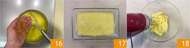 Fügen Sie die abgetropfte und ausgedrückte Gelatine hinzu 16, mischen Sie und geben Sie die Creme in eine Auflaufform 17, decken Sie sie mit Frischhaltefolie ab 17 und lassen Sie sie für 1 Stunde im Kühlschrank fest werden. Nach der Ruhezeit nehmen Sie die Creme, lockern sie mit dem elektrischen Schneebesen auf 18.