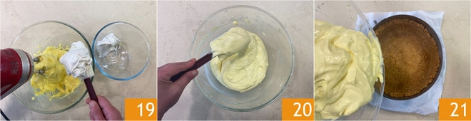 Fügen Sie den Mascarpone 19 nach und nach hinzu, ebenfalls mit dem Schneebesen, bis eine homogene und klumpenfreie Creme entsteht 20. Nehmen Sie den Keksboden, geben Sie die Creme darauf 21.
