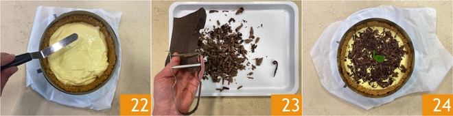 Verteilen Sie die Creme gleichmäßig 22. Stellen Sie die Torte für 4-5 Stunden in den Kühlschrank. Mit einem Gemüseschäler machen Sie Schokoladenlocken aus dunkler Schokolade und dekorieren Sie die Oberfläche der Torte. Vervollständigen Sie mit ein paar Minzblättern und servieren Sie die kalte Sahnetorte 24.