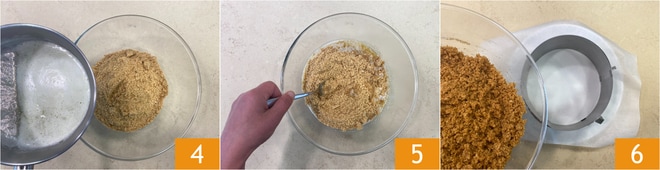 Geben Sie die Kekse in eine Schüssel, gießen Sie die abgekühlte geschmolzene Butter dazu (wir empfehlen, sie nicht mehr heiß zu verwenden) 4 und mischen Sie gut 5. Legen Sie einen 18 cm Durchmesser Ring (mit einem Rand von 6 cm Höhe) auf ein mit Backpapier ausgelegtes Tablett. Geben Sie die Keksmasse hier hinein 6