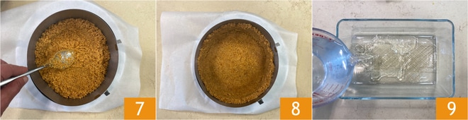Drücken Sie die Masse mit der Rückseite eines Löffels an 7, um den Boden zu verdichten 8. Stellen Sie ihn für 30 Minuten in den Kühlschrank, um zu festigen. Bereiten Sie die Creme vor: Weichen Sie die Gelatine 10 Minuten in kaltem Wasser ein 9.
